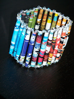 - A bracelet made from recycled WIRED magazines, to pick up on the computer geeky side of my partner Shannin. (She’s studying computer science.)