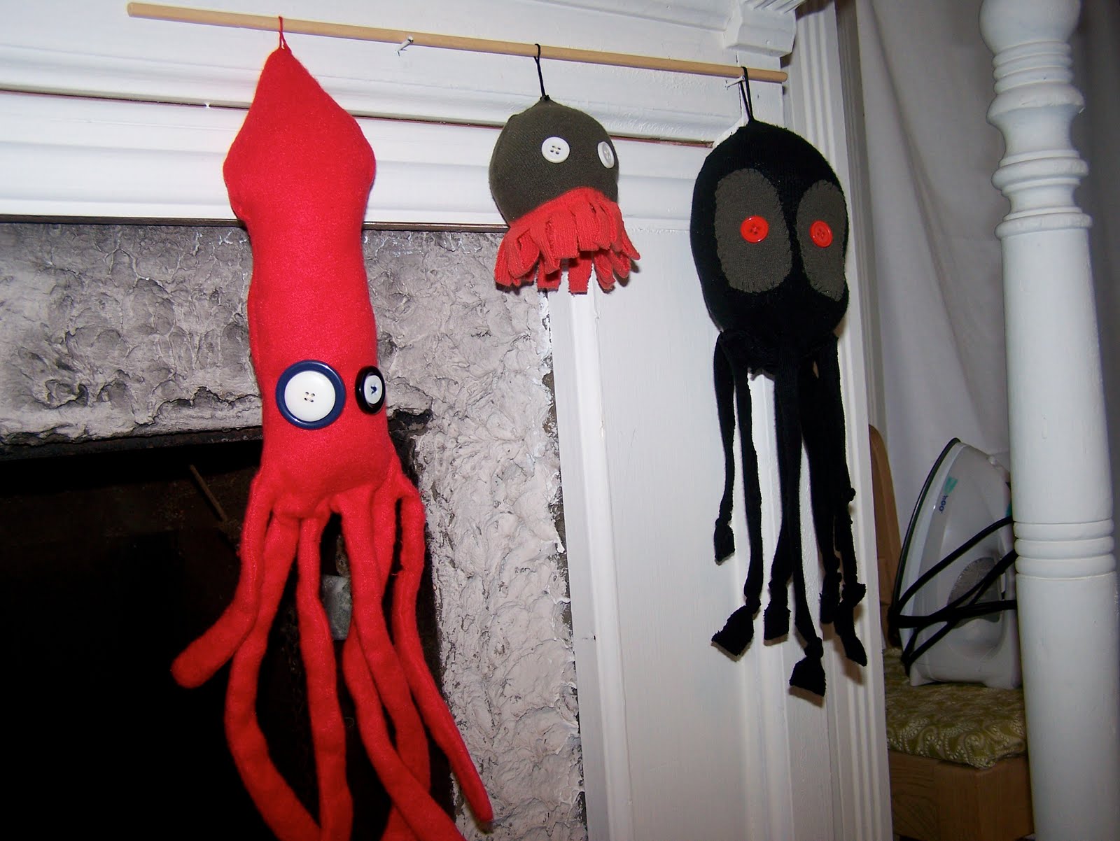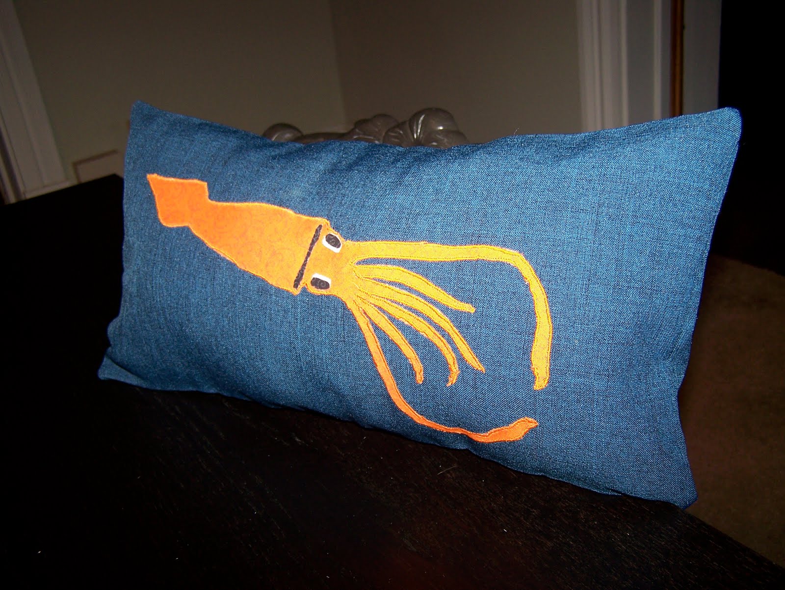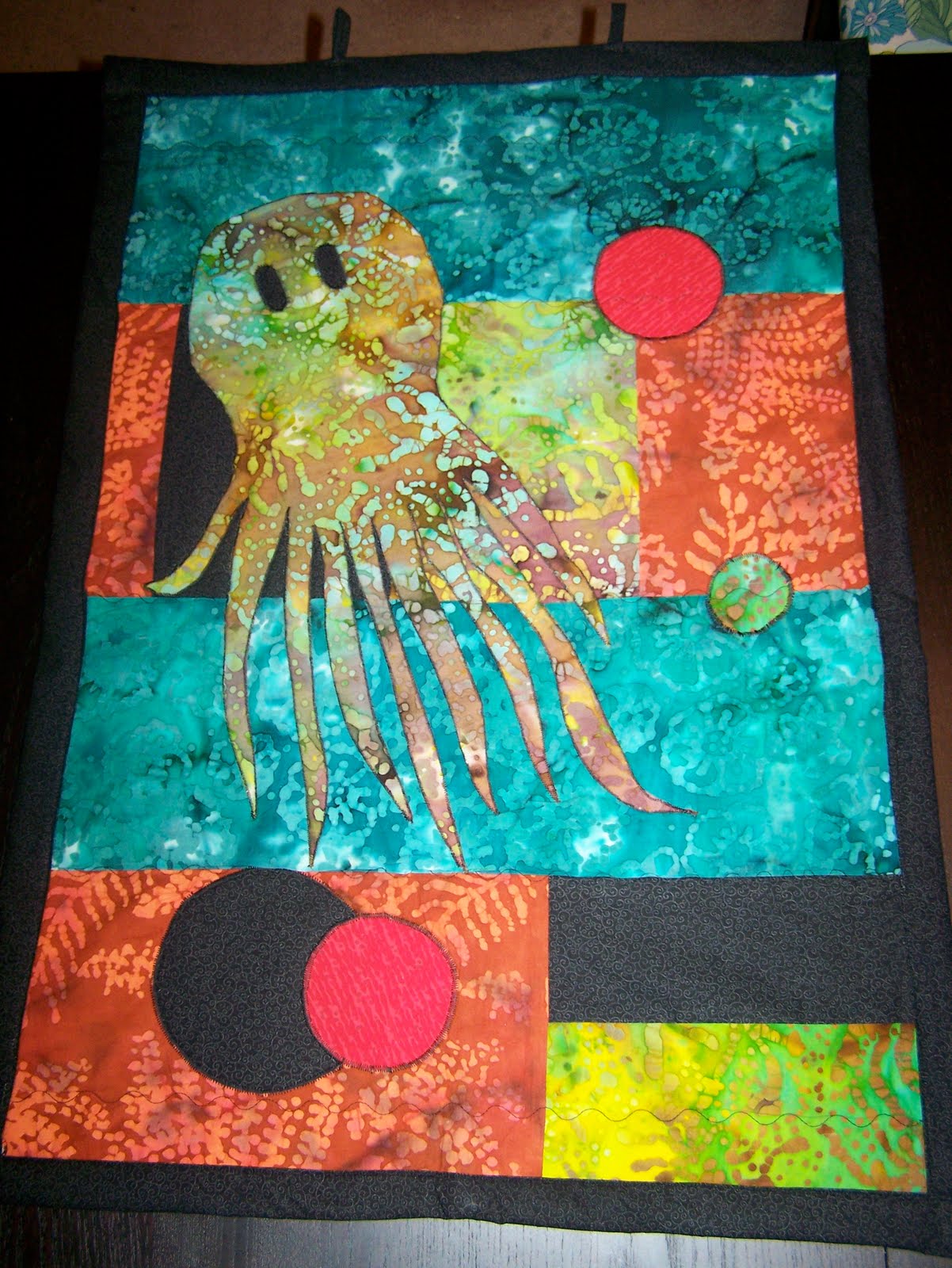 Squid throw pillow, stuffed squid, jellyfish and “socktopus”, and octopus miniquilt.