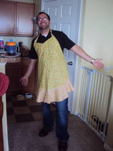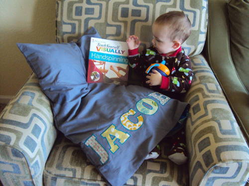 For a recent craft swap, I made an apron for my partner (modeled by her husband). I also made an embroidered pillowcase for her son Jacob and sent her a copy of Teach Yourself Visually Handspinning (Wiley). These are the photos she posted–and I’ll post again when I receive my package from her!