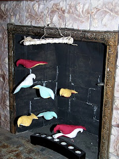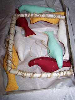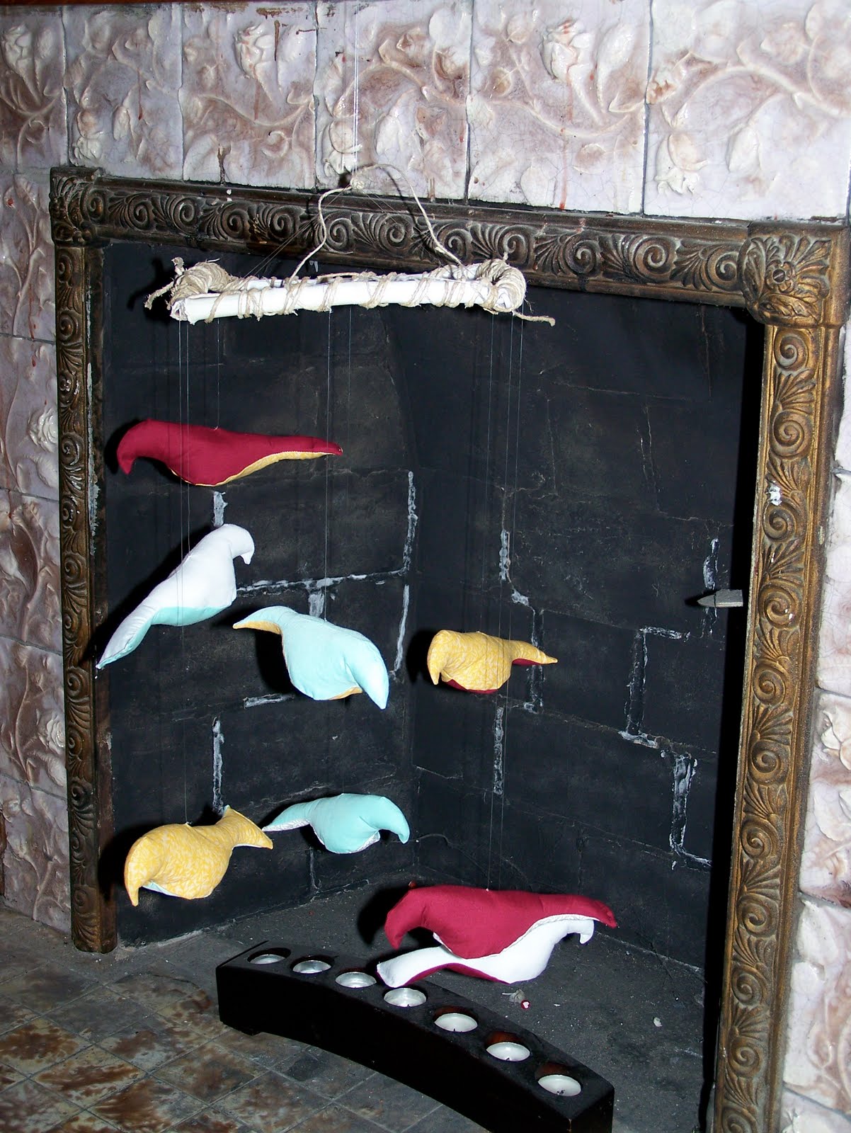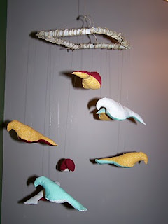 Colors: maroon, butter yellow, robin’s egg blue and white. Made from fishing line and recycled cardboard, twine and an ethernet cord.