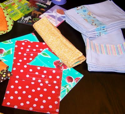 Here’s my contribution. For one of my first craft swaps, I made Barbara (a school teacher with two young kids) these handmade gifts. I included 4 oilcloth reusable sandwich bags, a silverware roll / placemat for her to take to school and eat lunch, and 8 reusable fabric napkins for her kids to take in their lunches.
