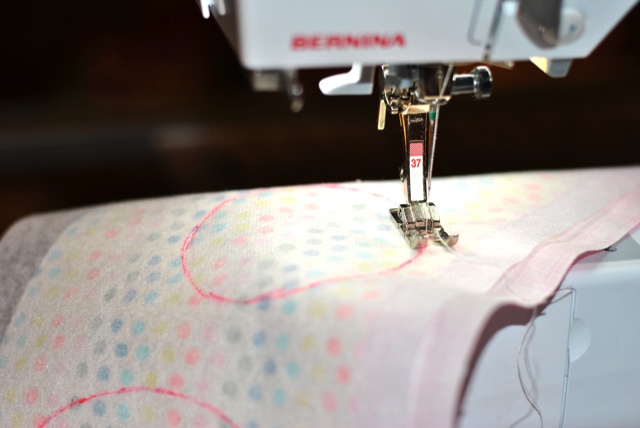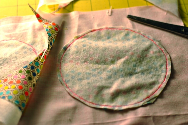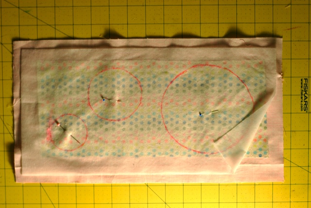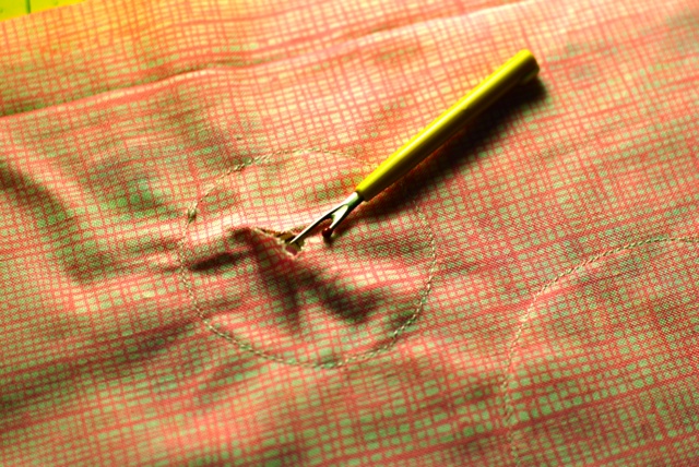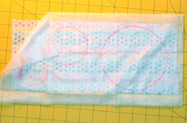 From behind the quilt block, pinch the back layer of fabric with your fingers. Use your seam ripper to poke a hole into the center of the front layer of fabric (into the center of your stitched circles), making sure not to poke through the back layer of fabric or interfacing.