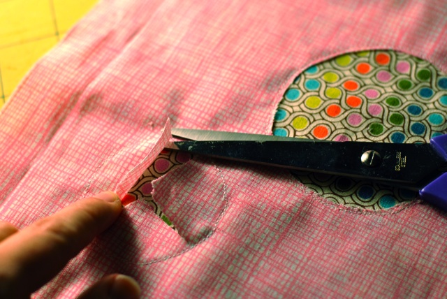 Flip over the quilt block to the back, and carefully trim away the excess fabric and interfacing around the stitched shapes to remove excess bulk.